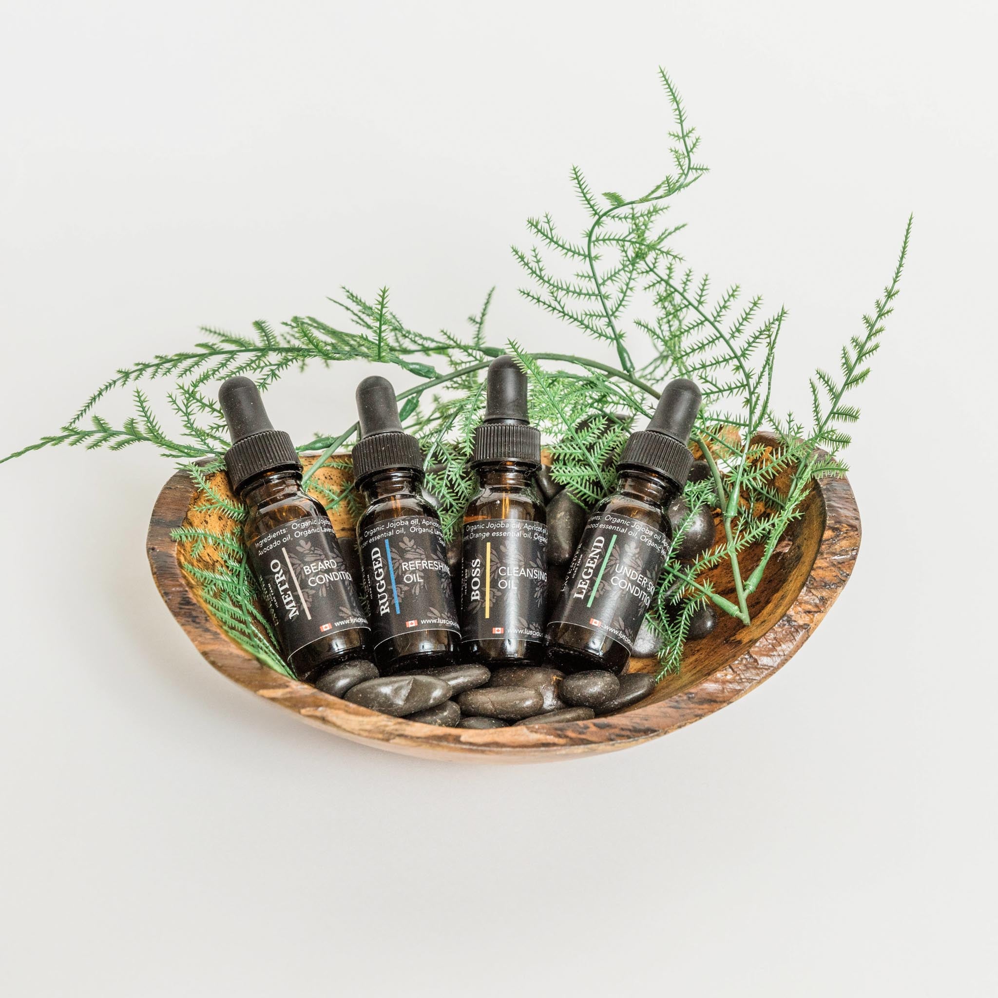 Rugged: A blend of Organic Jojoba oil, Apricot oil, Avocado oil, Organic Lavender Essential oil, Organic Lemon Essential oil and Organic Sage Essential oil. Rugged is perfect for the outdoors man.