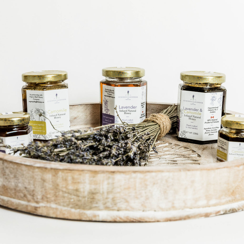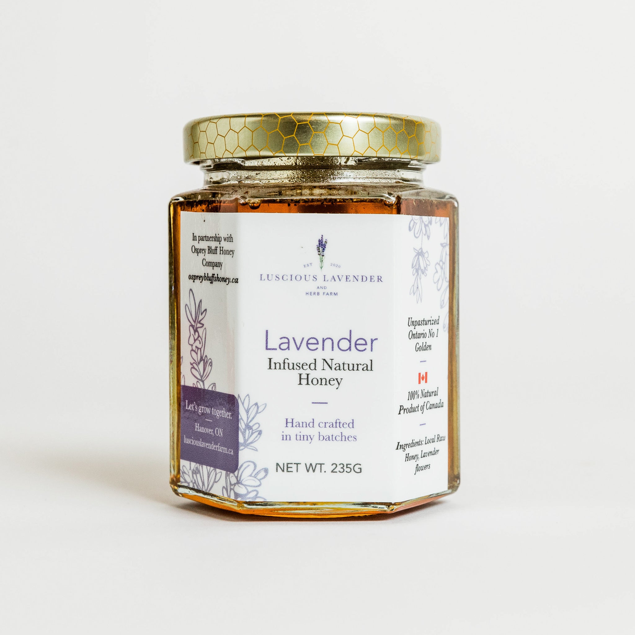 Luscious Lavender and Herb Farm’s own farm grown Lavender infused in local raw honey! The honey that you MUST have in your kitchen.